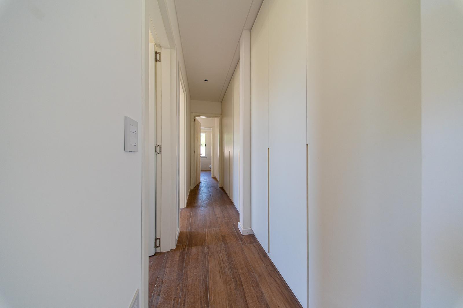 Desde la cocina se accede a un espacio de escritorio o playroom. A través de un pasillo distribuidor con placares empotrados completos se accede al baño completo, a un dormitorio con ventanas orientadas al Norte y al dormitorio principal en suite.