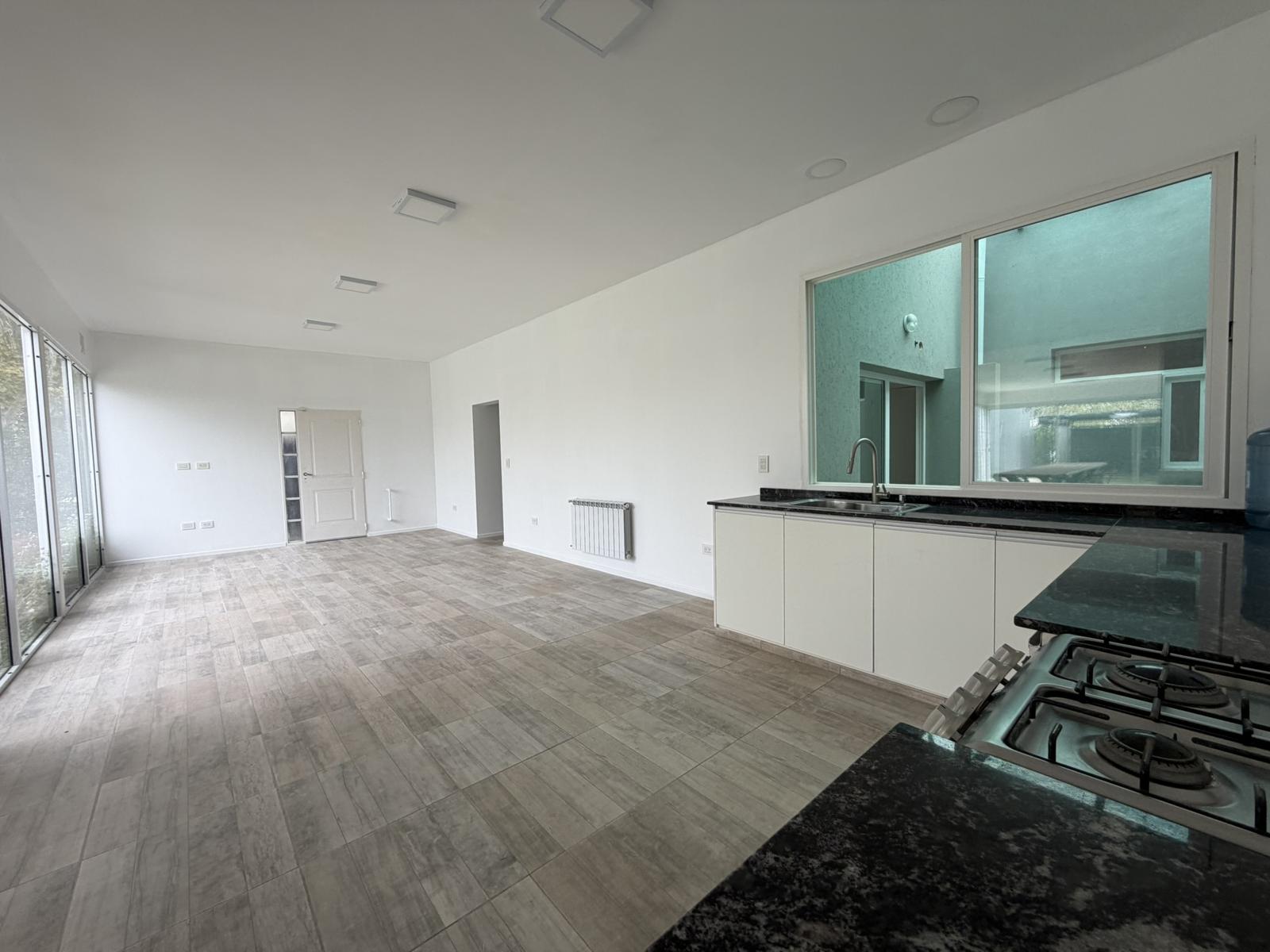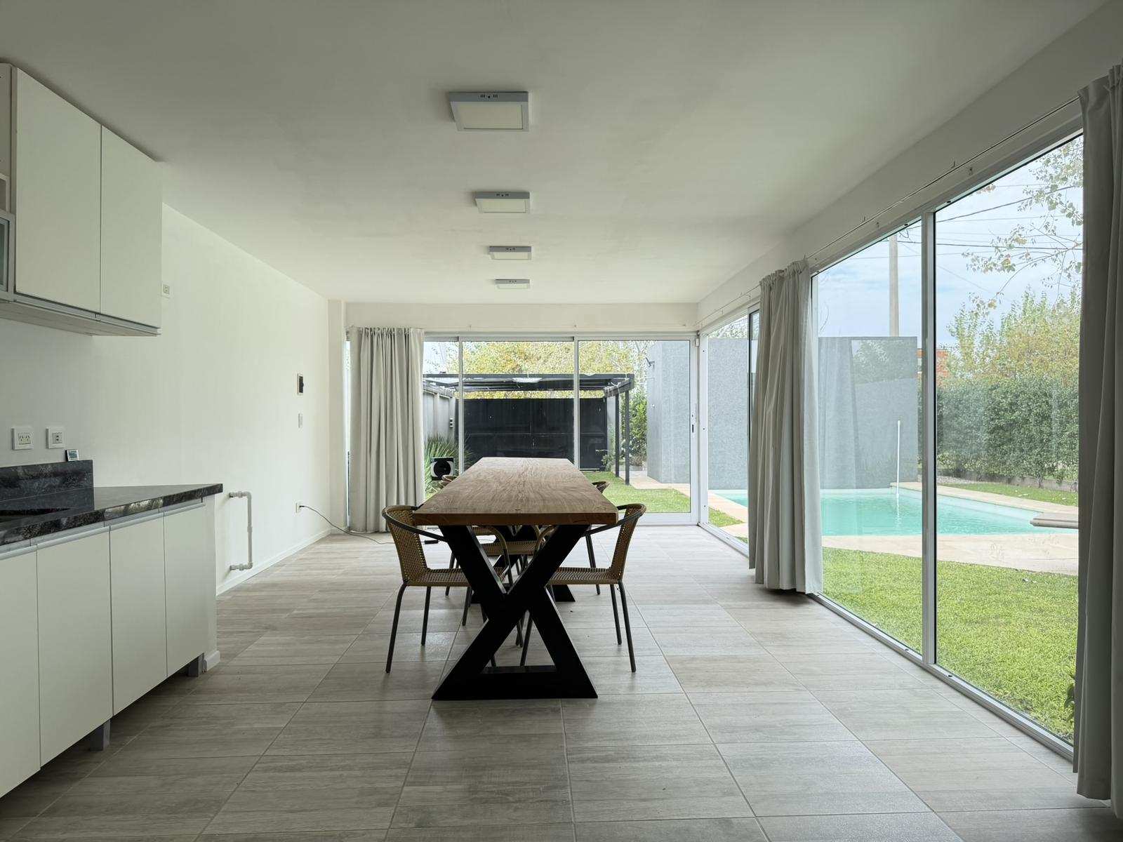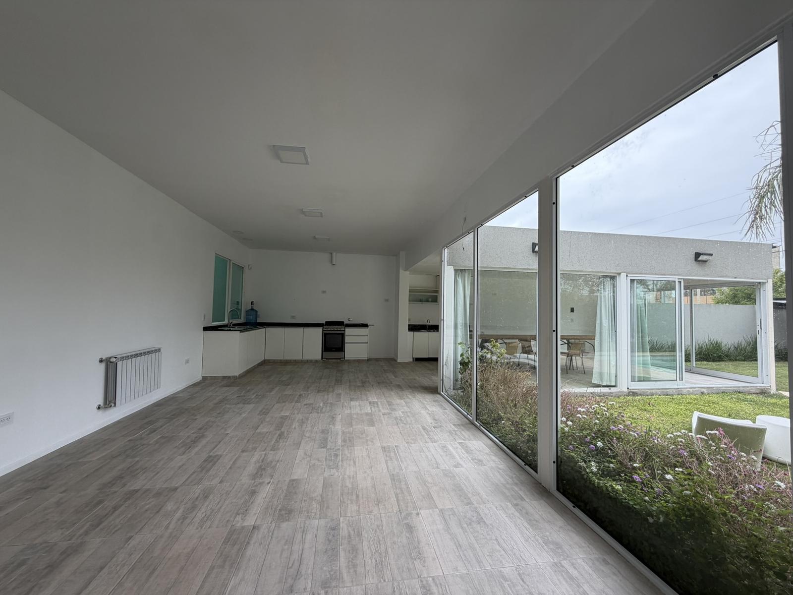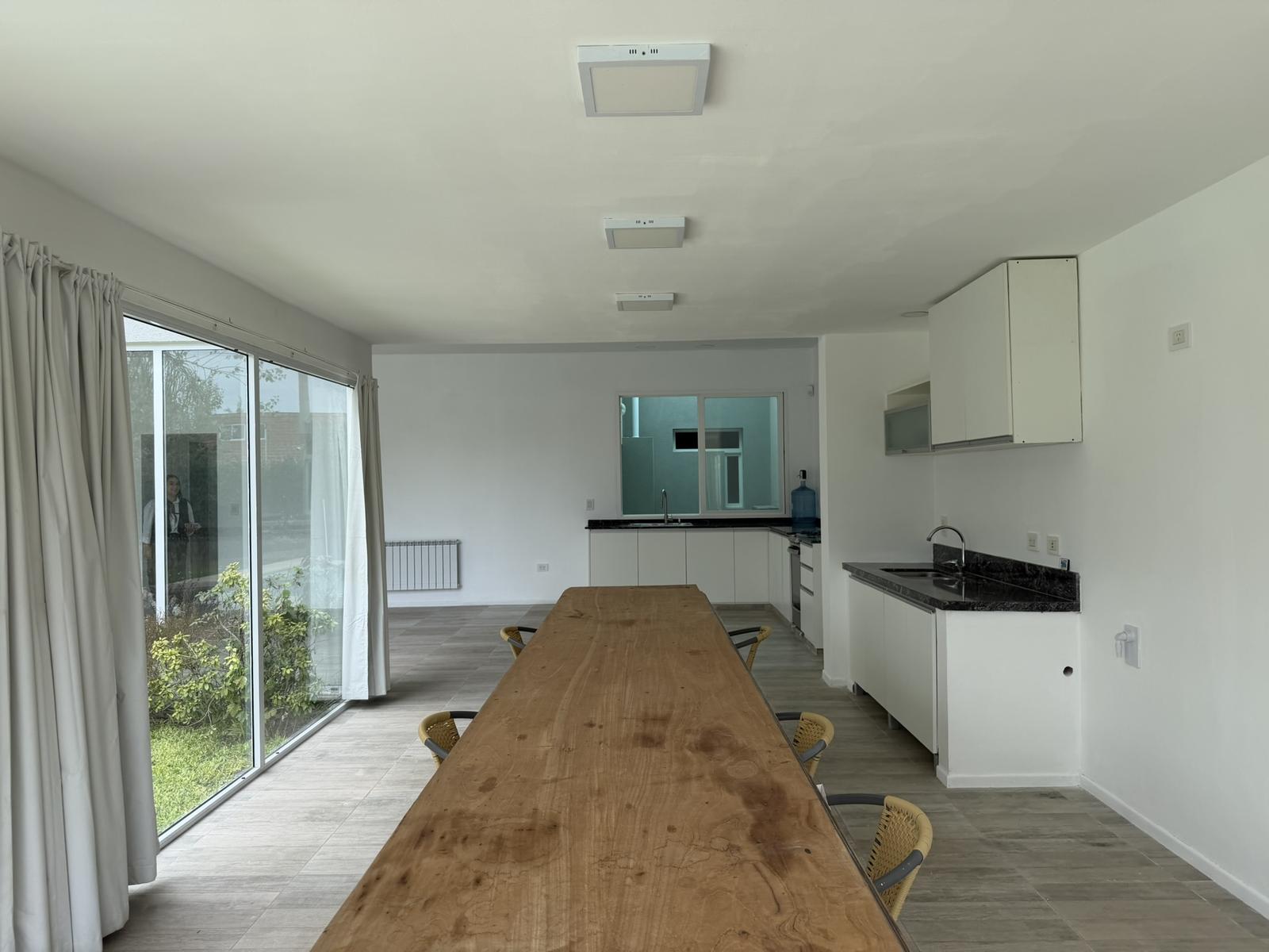Descripción de la unidad: Ingresamos a la casa por living comedor, cocina integrada completamente equipada con bajo mesada y conexión para lavarropas. El ambiente continua hacia un espacio tipo quincho, hoy integrado, pero que ofrece la posibilidad de independizarse, creando un ambiente separado.