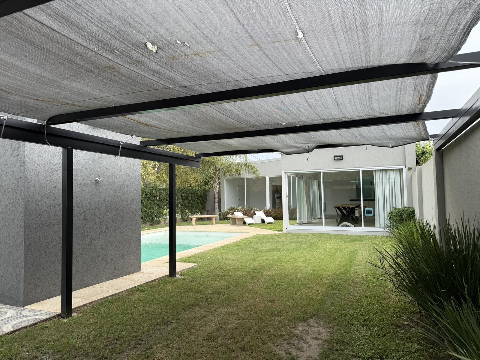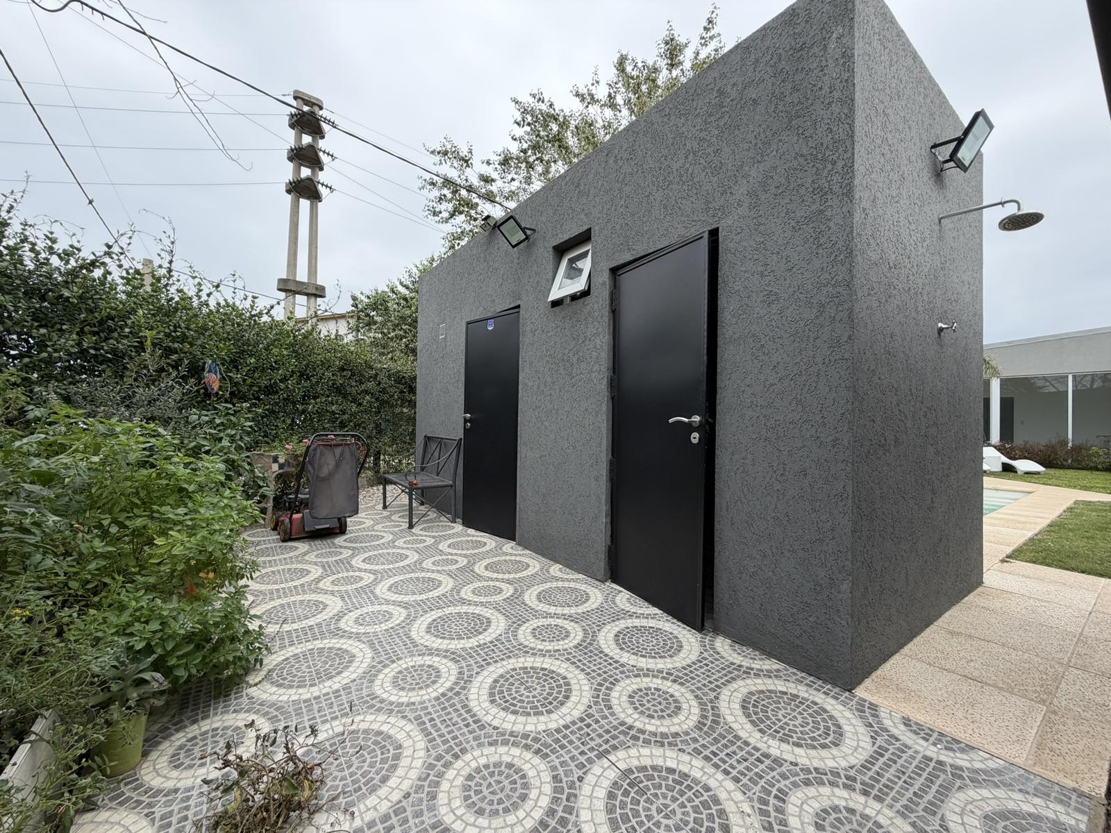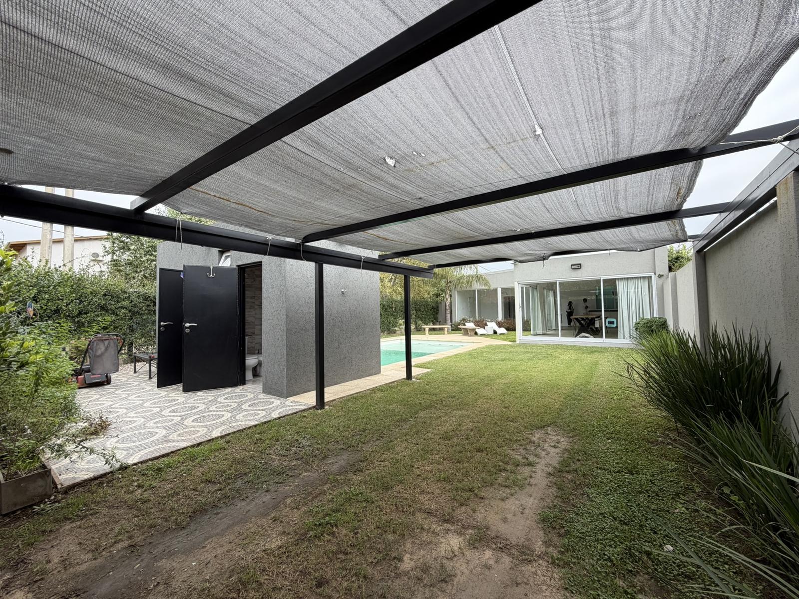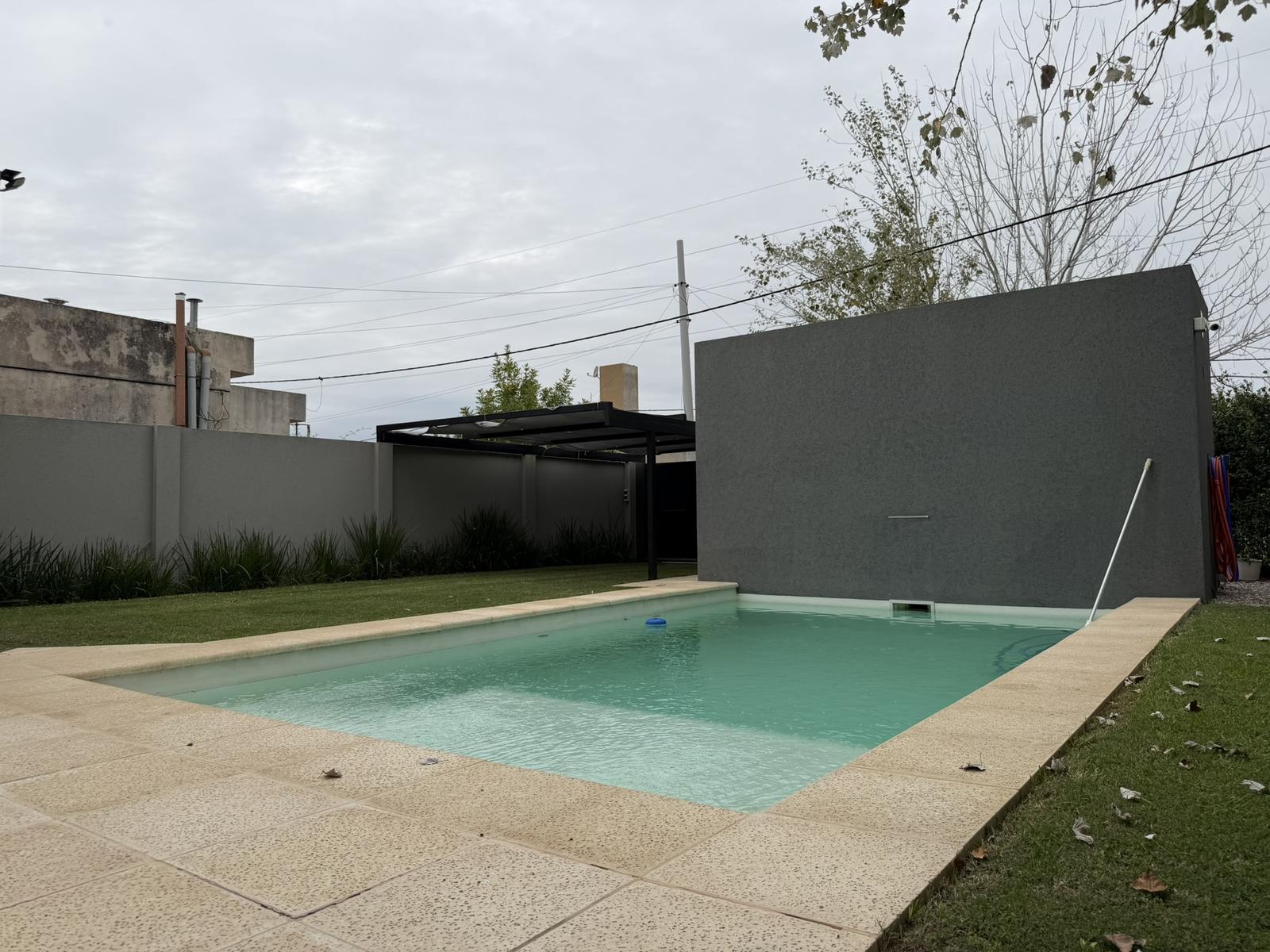 Además, posee un toilette. El jardin cuenta con pileta, un baño completo y cuarto de guardado. Cochera semi cubierta para 1 vehículo.