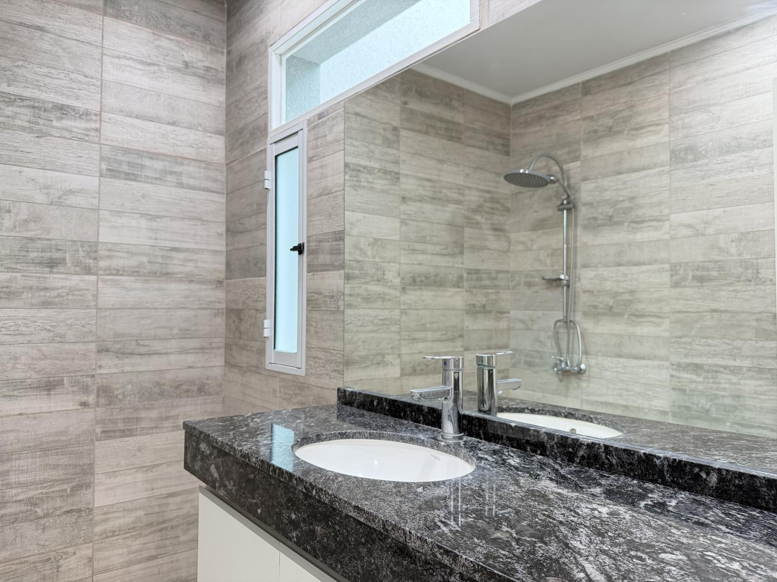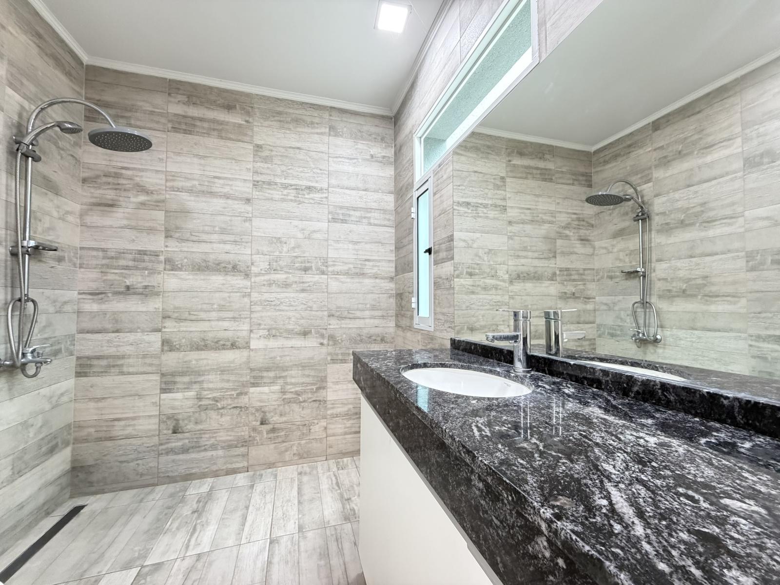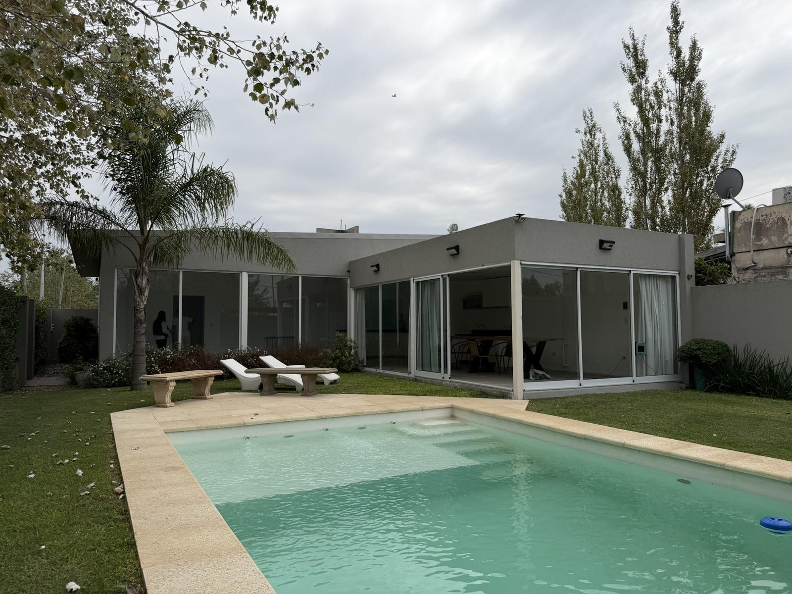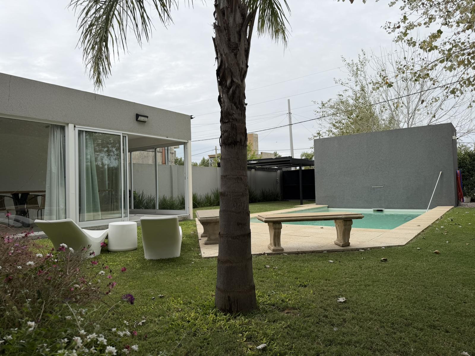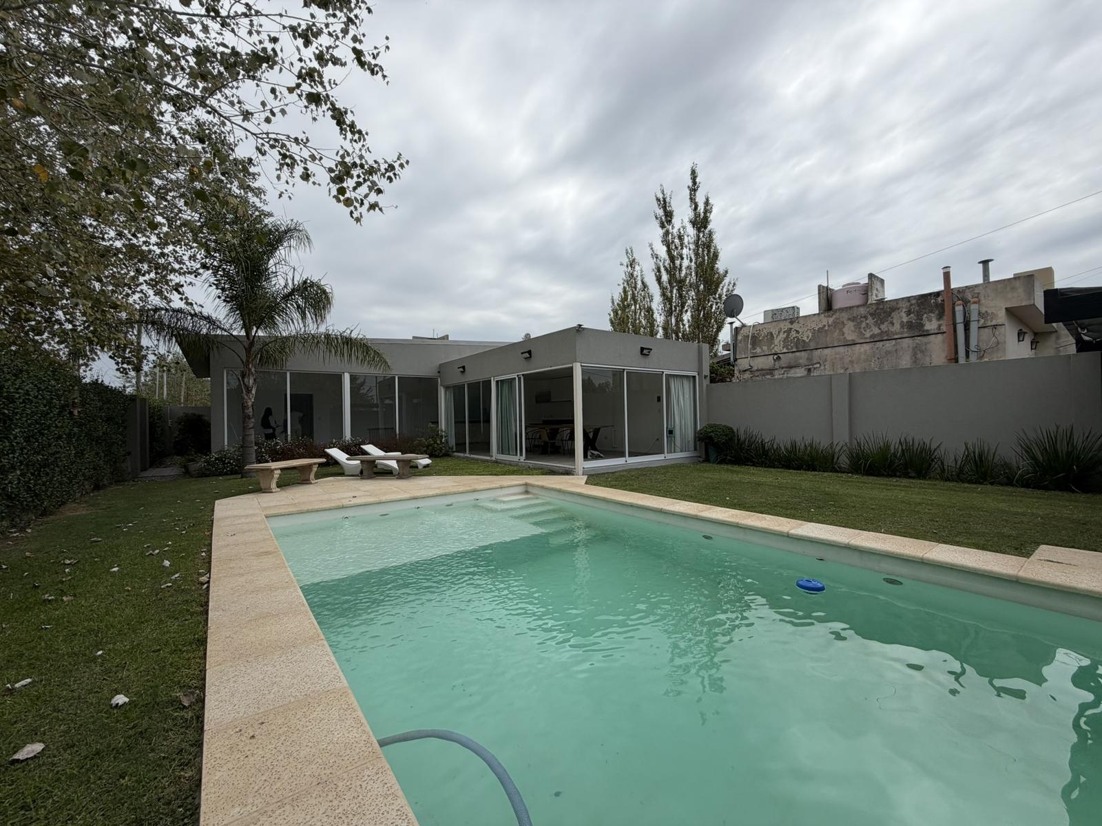 Además, posee un toilette. El jardin cuenta con pileta, un baño completo y cuarto de guardado. Cochera semi cubierta para 1 vehículo.