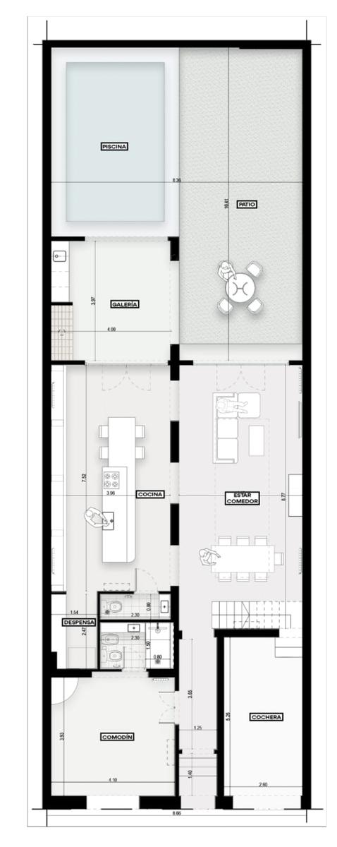 Planta Baja:Hall de recepción, amplia cocina semi integrada con isla y espacio de guardado, gran living-comedor con excelente luz natural, toilette, y un ambiente comodín con baño propio que puede utilizarse como dormitorio, escritorio o playroom. Cochera cubierta, galería con parrillero y un patio verde con pileta y sector de solárium.