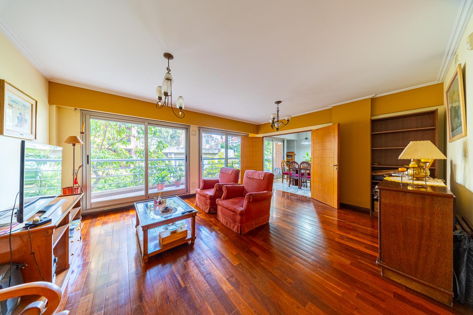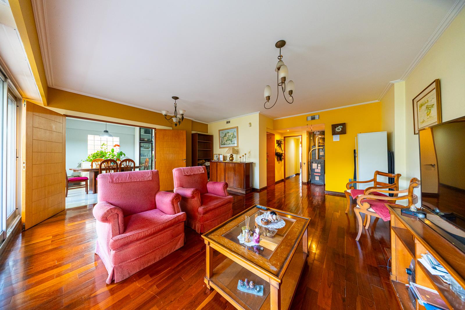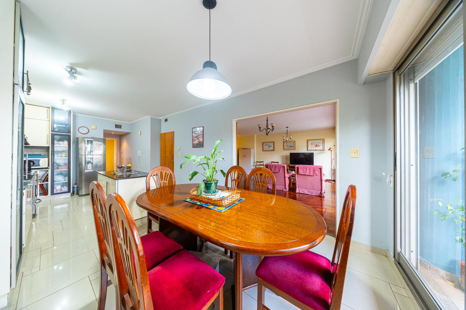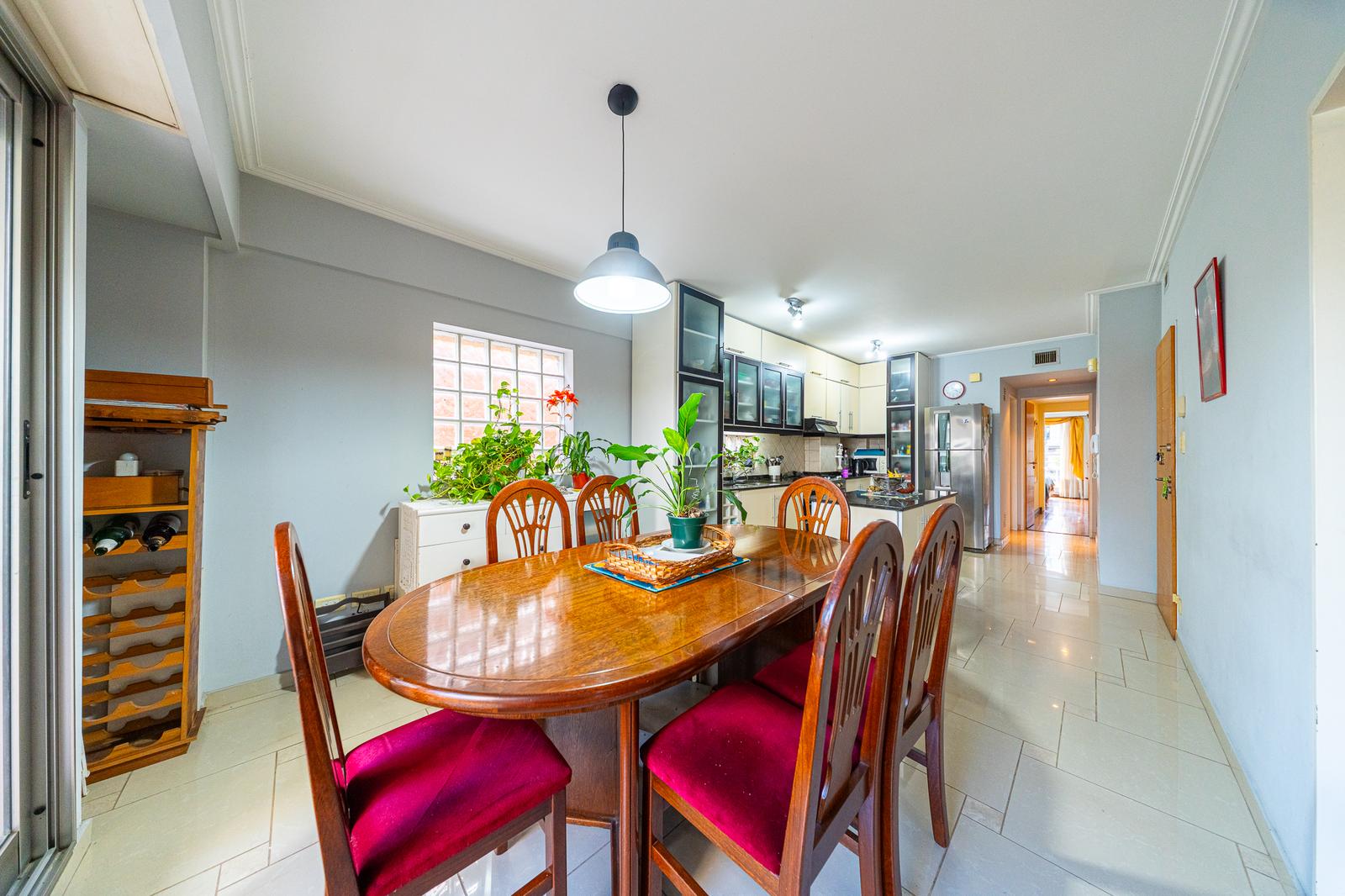 Al ingresar por el acceso principal, nos recibe un amplio living comedor con salida a balcón corrido al frente. Este ambiente se vincula con la cocina comedor mediante una elegante puerta de madera de dos hojas de abrir, permitiendo integrar o independizar los espacios según la necesidad.