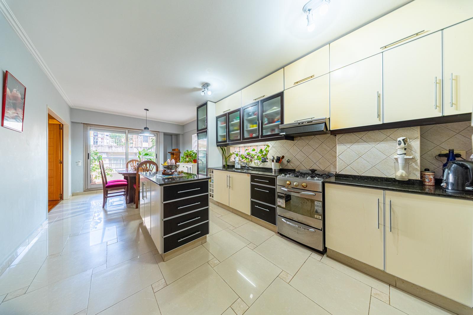 La cocina comedor, equipada con isla, también cuenta con salida al balcón, logrando una excelente conexión con los espacios sociales.