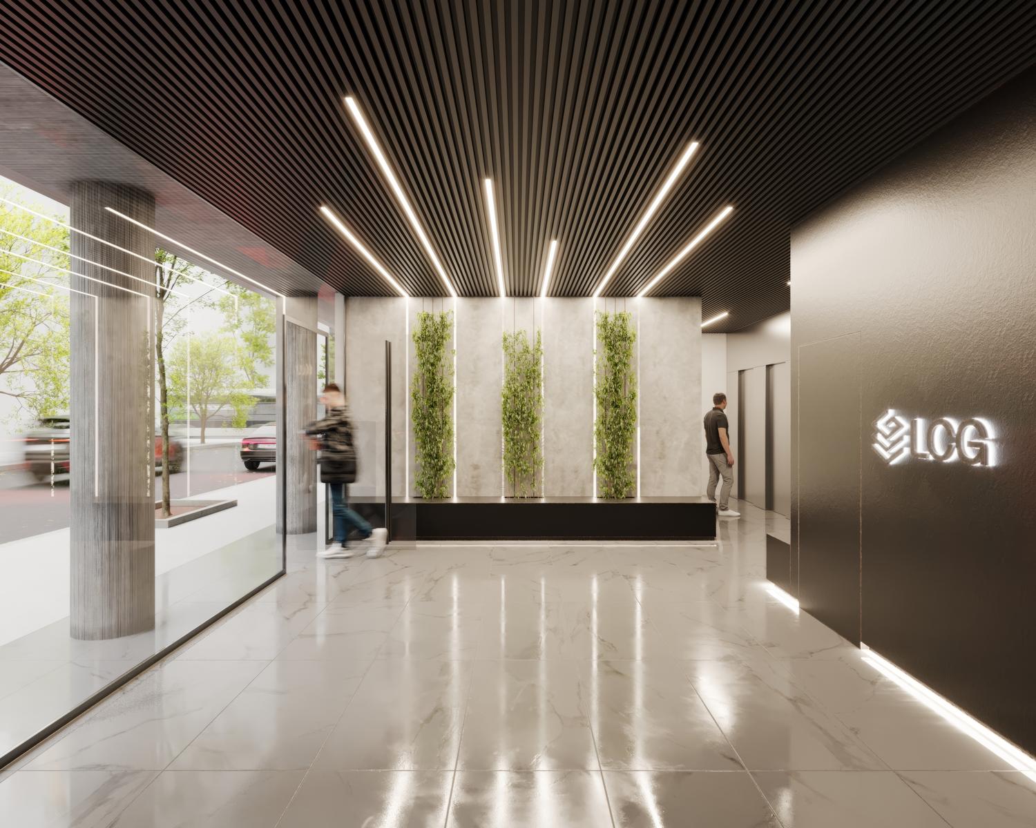 Proyecto: Edificio España, con hall de ingreso jerarquizado por su doble altura y calidad de terminaciones.
