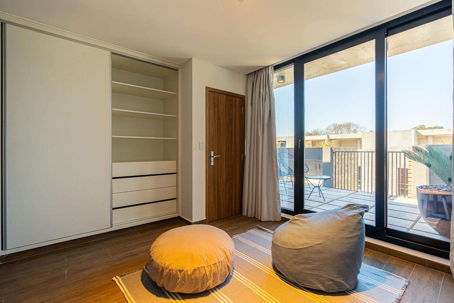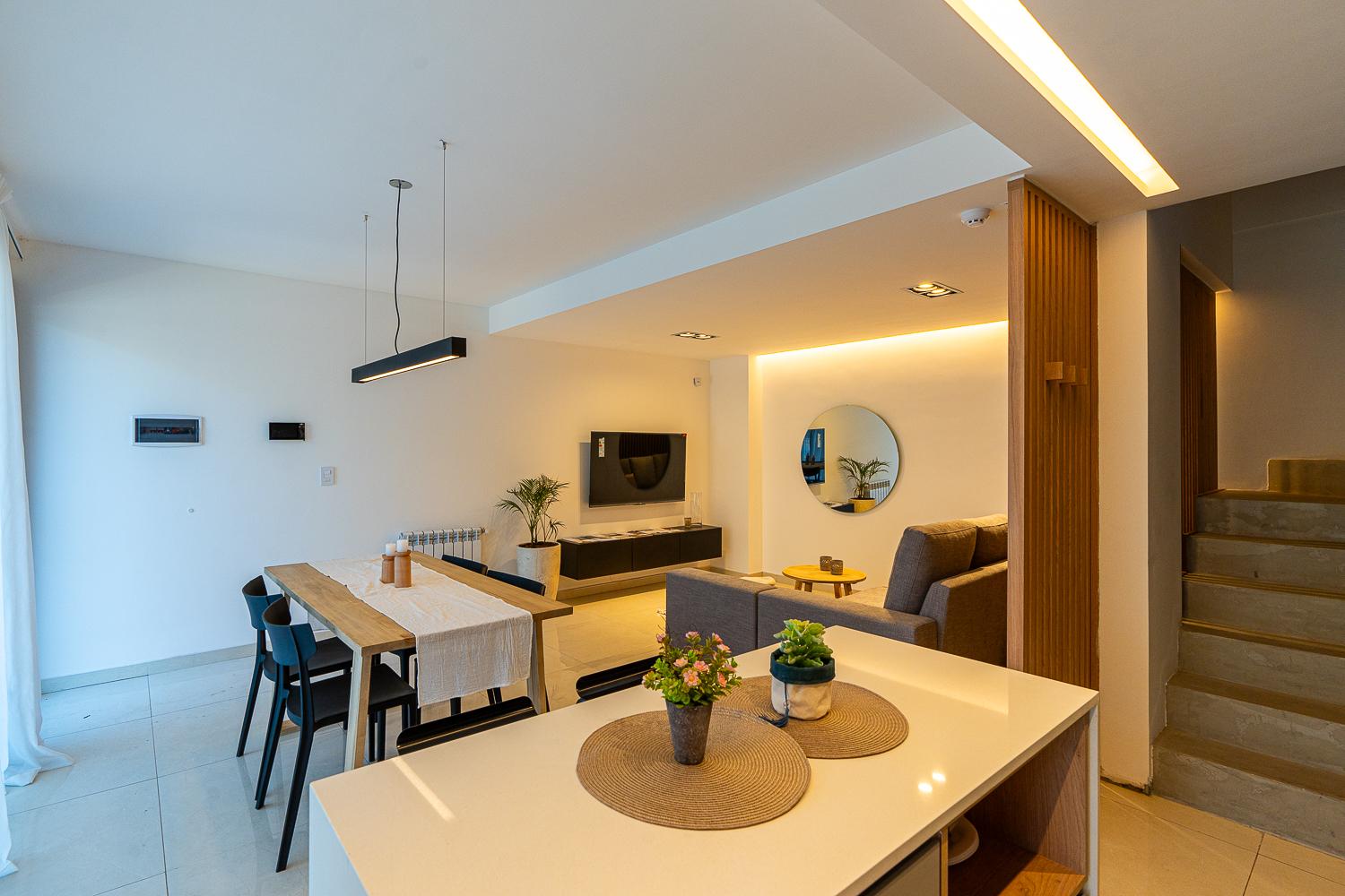 Descripción de la unidad: En planta baja tenemos un comedor integrado a la cocina con amoblamiento completo y un toilette de servicio. En la misma planta hay una galería semi cubierta con parrillero y un patio de uso exclusivo con un espejo de agua. En la planta alta tenemos dos dormitorios, uno de ellos con baño en suite y vestidor con salida a un balcón. En la misma planta encontramos un segundo baño completo y placares con interiores terminados. La casa tiene una azotea de uso exclusivo con posibilidad de generar un tercer dormitorio con baño.