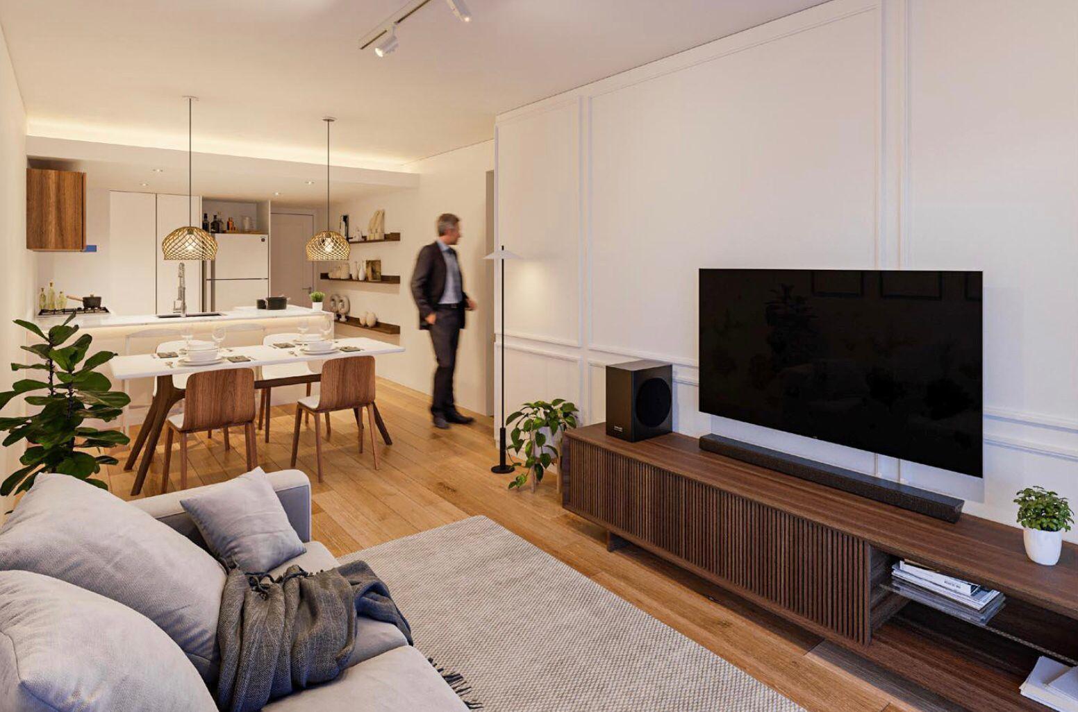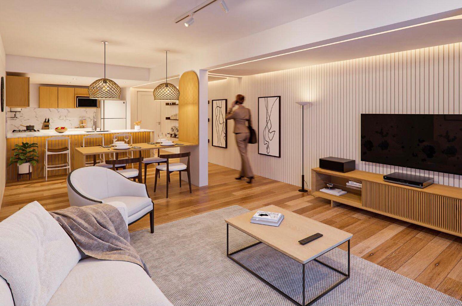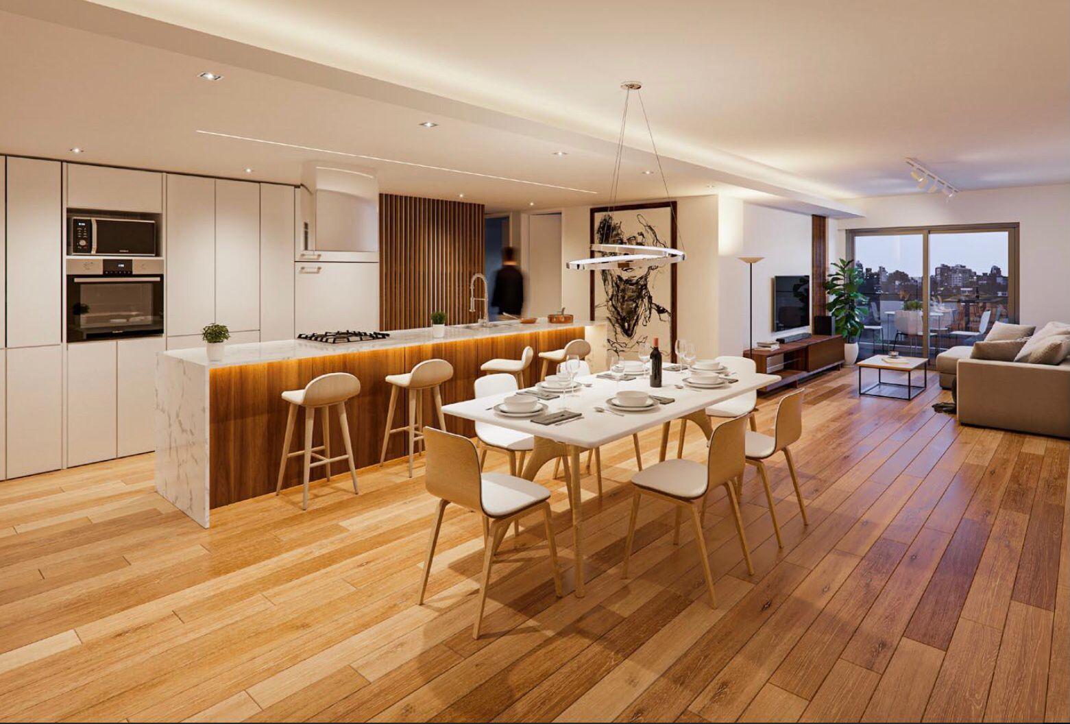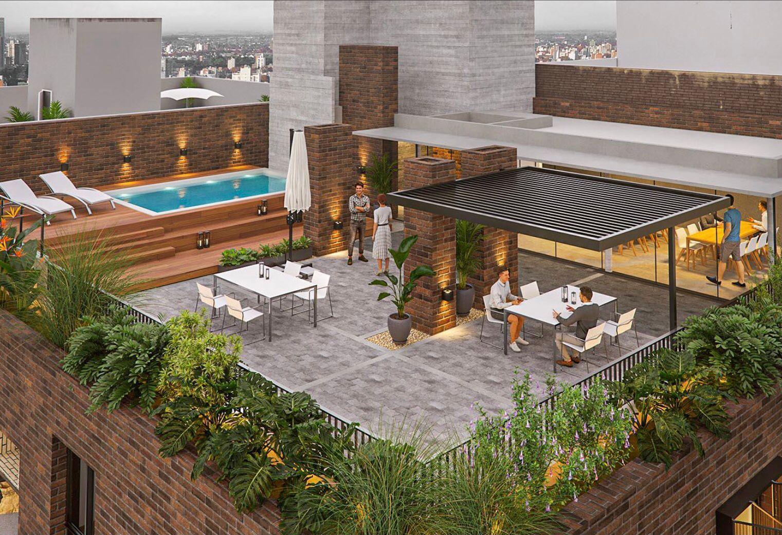 DESCRIPCION:Calidades nobles orientadas a una arquitectura moderna con pisos vinílico/ porcelanato, todo con su correspondiente zócalo de 1/2 x3.Placares con frentes de placar de melamina 18 mm y kit aluminio para sistema corredizoCocina con mobiliario completo de bajo mesadaAlacena con perfil de aluminio anodizado.Mesada de granito, se entregará con horno empotrado y anafe diferenciado, de marca acreditada, bacha Johnson de acero inoxidable con griferia monocomando FV.Calefacción por radiadores y agua caliente por caldera dual para 2 y 3 dormitorios.Las puertas principales de ingreso a los departamentos son de madera lustrada, burlete de goma y cerradura de seguridad.Las puertas interiores del departamento son puertas placas y llevan pintura semi-mate color blanco.Aberturas con marcos y hojas de aluminio, DVH, línea A30 o similar, asegurando escuadría y durabilidad.Paredes de yeso proyectable para interiores, con terminación lisa, espejada, uniforme.Preinstalacion de Aire Acondicionado en cada ambiente.BAÑO: pisos y paredes revestidas de cerámico de primera calidad, inodoros con descarga tipo mochila, bidet y lavatorio (marca: Roca Línea Mónaco) y Grifería FV (ducha, lavatorio y bidet).Amenities en azotea de quincho y pileta
