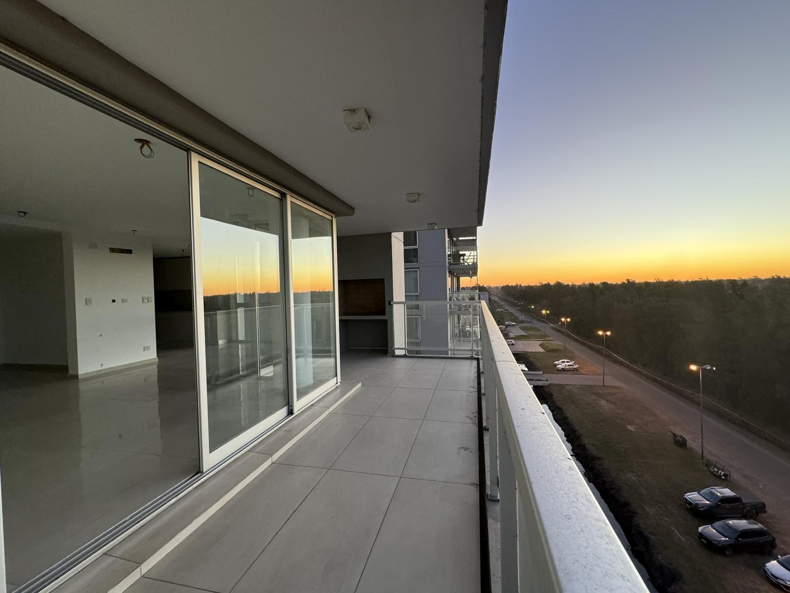 Se accede al edificio por una importante recepción con ascensores modernos, el cuál nos lleva al palier que comparte con otros dos departamentos. Se ingresa por puerta de madera de dos hojas que da al hall de recepción, integrado a un amplio living y comedor en concepto totalmente abierto, con una impactante vista verde y al lago del Barrio Aldea Lago. Salida inmediata a balcón aterrazado con parrillero propio, a través de amplios ventanales a medida, de piso a techo, con marcos de aluminio y DVH, que garantizan una optima iluminación y eficiencia, tanto térmica como sonora. Cocina semi integrada con mesada de granito, amplios mobiliario de diseño con alacenas y bajo mesada, anafe por inducción y horno eléctrico empotrado. Bacha de acero inoxidable, grifería monocomando de calidad.