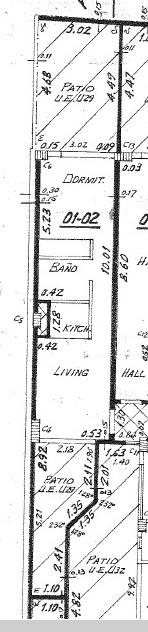 Pasillo distribuidor hacia el dormitorio con placard y baño completo, seguido de un amplio patio.