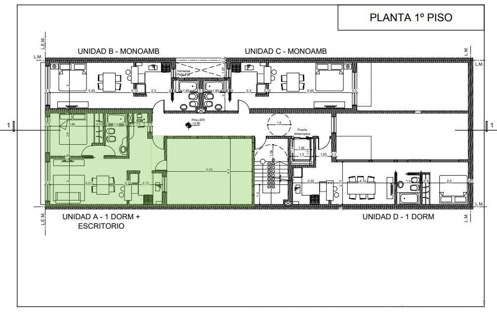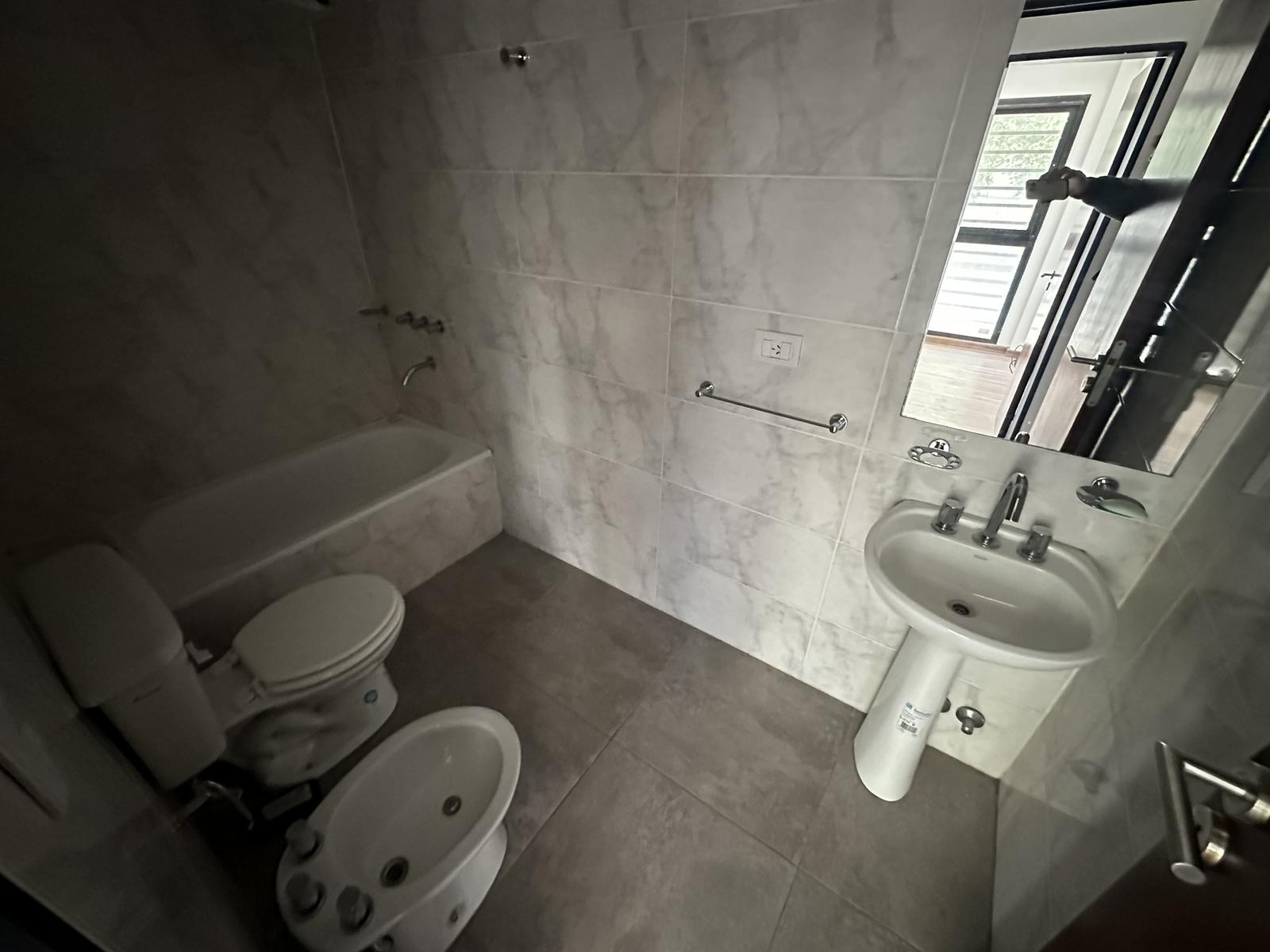 Unidad en primer piso, al frente.Departamento de 1 dormitorio con patio exclusivo. Sin balcon. Cuenta con espacio de escritorio.Ventilacion cruzada, luminoso.Dormitorio con placard y piso flotante de melamínico de alto tránsito.Sector para lavarropas. Termotanque y artefacto de cocina eléctricosEdificio electrico. A estrenar.Superficie exclusiva: 70,73 m2 (46,86 m2 cubiertos y 23,87 de patio)Orientacion: Oeste.Antiguedad del edificio: 5 años.Expensas aproximadas: $70.000.-Entrega inmediata.