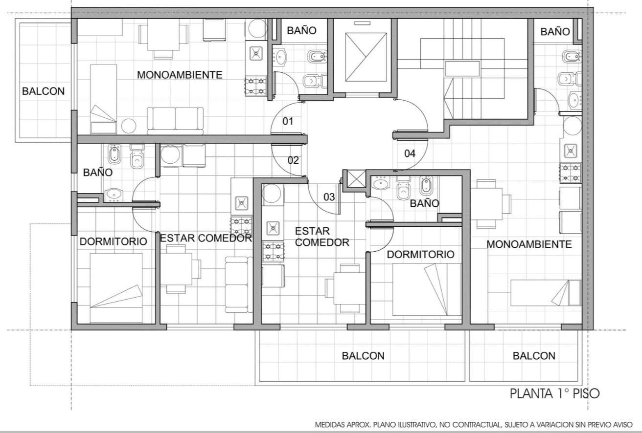 Unidades disponibles: 01-02 Departamento 1 dormitorio al frente sin balcón 29m2 u$s 47.50001-03 Departamento 1 dormitorio al frente con balcon 31m2 u$s 49.900