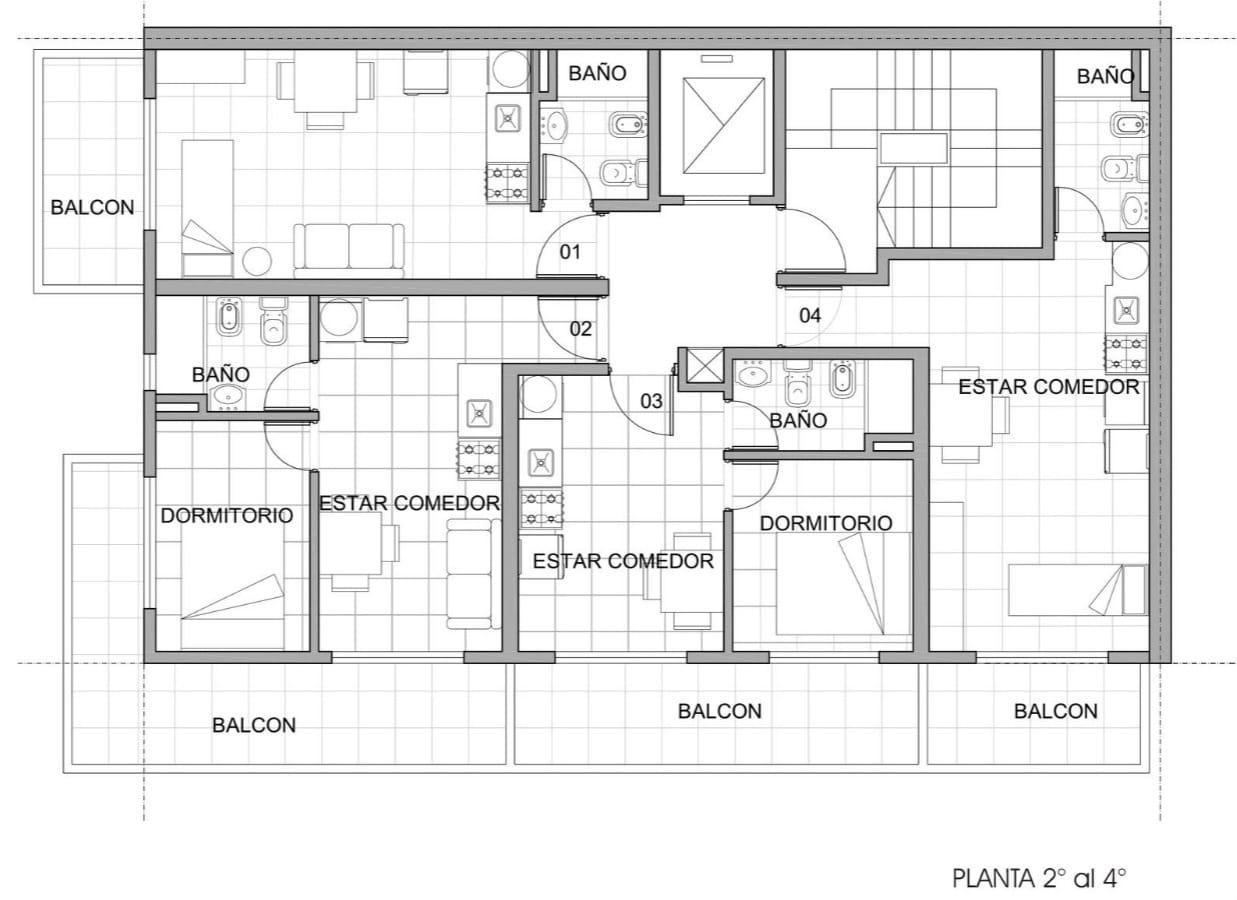 Proyecto: Edificio de 4 pisos, compuesto por 8 unidades de un dormitorio y 8 monoambientes. En planta baja se encuentra un local comercial.